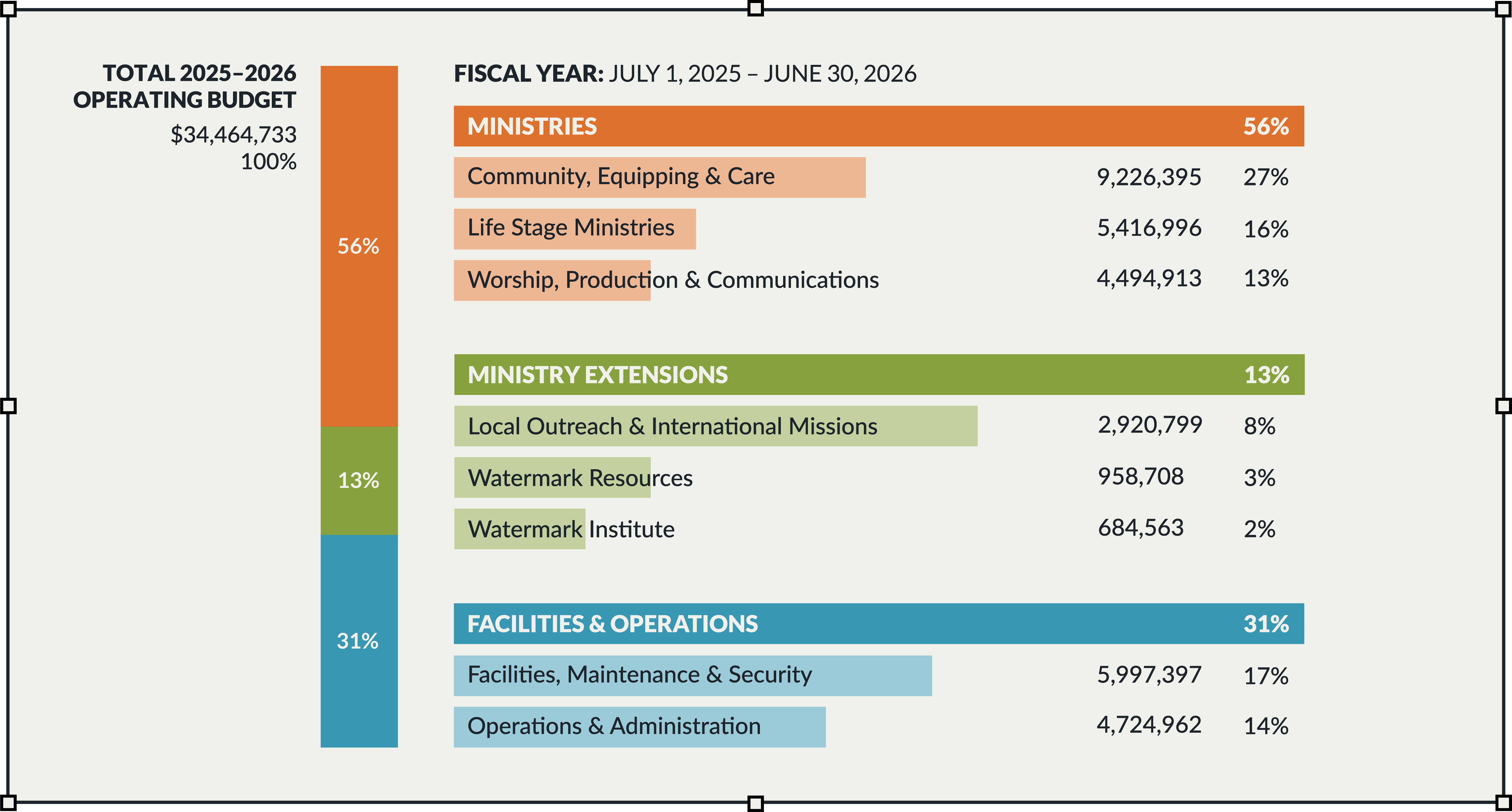 Watermark ended the 2024–2025 fiscal year on June 30, 2025, with a $272,496 deficit, which we covered through cash reserves. Giving for this fiscal year (ending June 30, 2026) is currently behind pace to meet this year’s budget by $427,000 and will require us to draw from cash reserves if this trend continues.